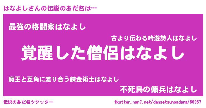 | 男性向けラノベタイトル風あだ名 | 『はなよしの嫁は女の子じゃないと思った?』 |