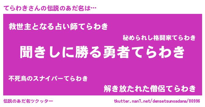 | 男性向けラノベタイトル風あだ名 | 『てらわきという概念が存在しない退屈な世界 』 |