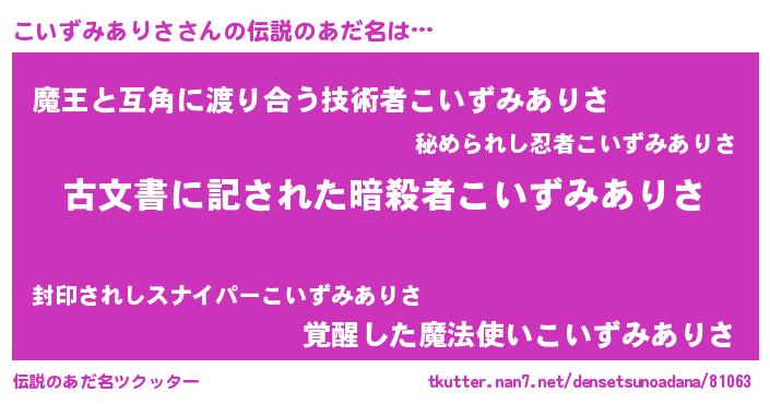 | 男性向けラノベタイトル風あだ名 | 『こいずみありさに滅ぼされるだけの簡単なお仕事です』 |