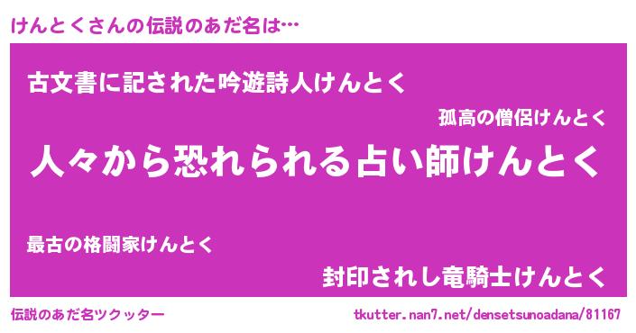 | ヒーロー風カッコイイあだ名 | 『正義の使者けんとく』『仮面ケンダー』 |
