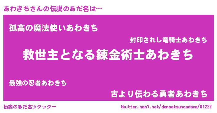 | 女子向けラノベタイトル風あだ名 | 『死神あわきちの再婚』 |
