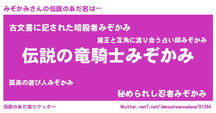 | 男性向けラノベタイトル風あだ名 | 『みぞかみの憂鬱』『緋弾のミゾカミ』 |