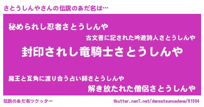 | ヒーロー風カッコイイあだ名 | 『スーパーサトウシンヤ』『銀牙騎士サト』 |