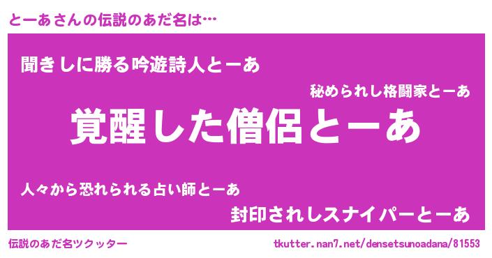 | 意味不明あだ名 | 『とにかく怪しいとーあ』『自称とーあ』 |