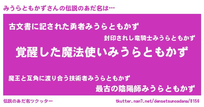 | 男性向けラノベタイトル風あだ名 | 『みうらともかずの嫁は女の子じゃないと思った?』 |