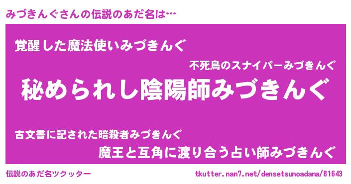 | 男性向けラノベタイトル風あだ名 | 『魔弾の王とみづきんぐ』 |