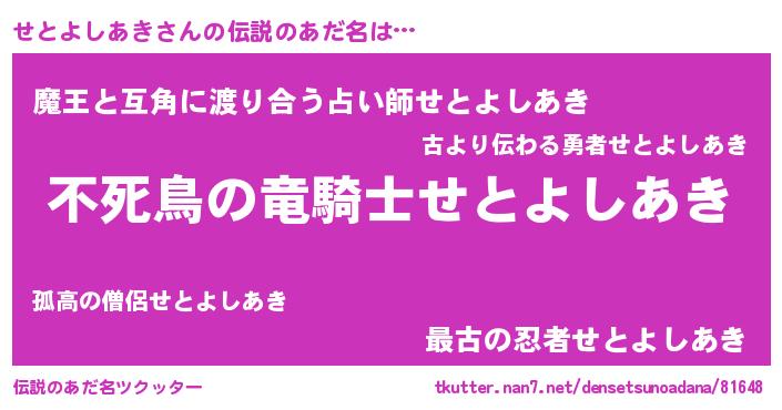 | ヒーロー風カッコイイあだ名 | 『スーパーセトヨシアキ』『仮面セトダー』 |