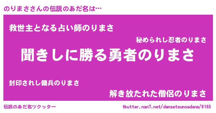 | 女子向けラノベタイトル風あだ名 | 『異世界で失敗しない100ののりまさ』 |