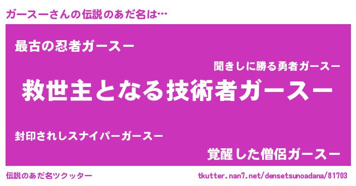 | ヒーロー風カッコイイあだ名 | 『慈愛の使者ガースー』『暗黒騎士ガー』 |