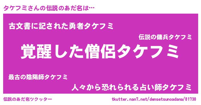 | ヒーロー風カッコイイあだ名 | 『炎刃騎士タケ』『究極戦士タケフミ』 |