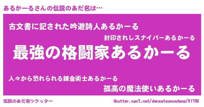 | 男性向けラノベタイトル風あだ名 | 『うちの娘の為ならば、俺はもしかしたらあるかーるも倒せるかもしれない。』 |