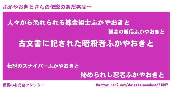| 男性向けラノベタイトル風あだ名 | 『誰もが恐れるあのふかやおきとが、ぼくの専属メイドになるようです。』 |