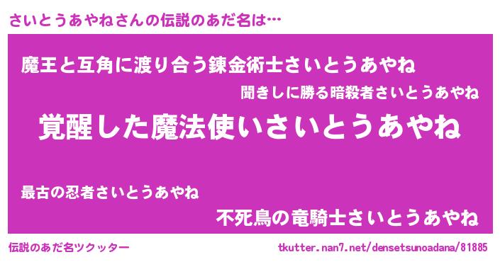 | 男性向けラノベタイトル風あだ名 | 『さいとうあやねの嫁は女の子じゃないと思った?』 |