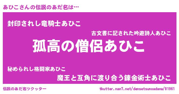 | ヒーロー風カッコイイあだ名 | 『仮面アヒダー』『天弓騎士アヒ』 |