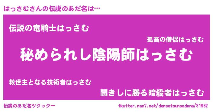 | 意味不明あだ名 | 『エリンギ科はっさむ属』『自称はっさむ』 |