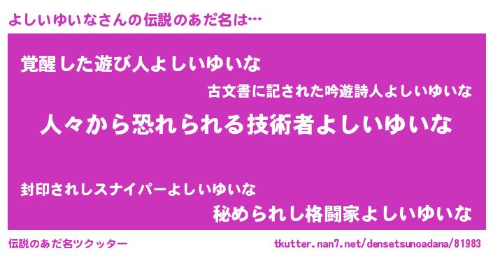 | ヒーロー風カッコイイあだ名 | 『仮面ヨシダー』『愛の使者よしいゆいな』 |