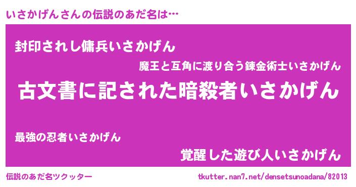 | 意味不明あだ名 | 『自称いさかげん』『永久保存いさかげん』 |