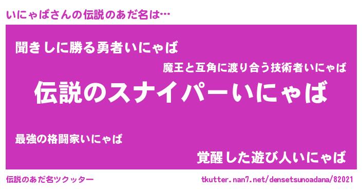 | 意味不明あだ名 | 『自称いにゃば』『めかぶ科いにゃば属』 |
