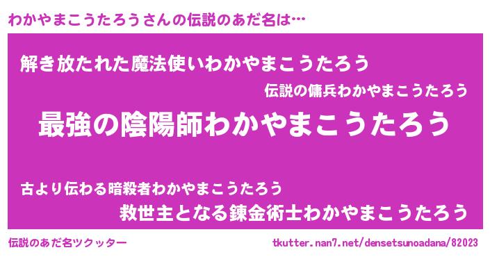 | 男性向けラノベタイトル風あだ名 | 『わかやまこうたろう~年齢イコール彼女いない歴の魔法使い~』 |