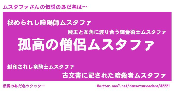 | ヒーロー風カッコイイあだ名 | 『魔戒騎士ムス』『ネオムスタファ』 |