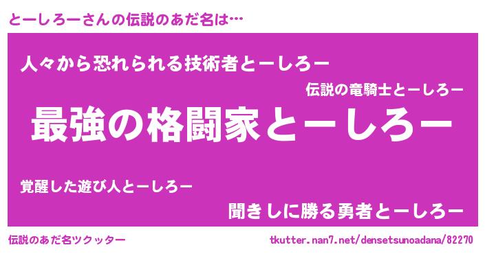 | ヒーロー風カッコイイあだ名 | 『仮面トーダー』『正義の使者とーしろー』 |
