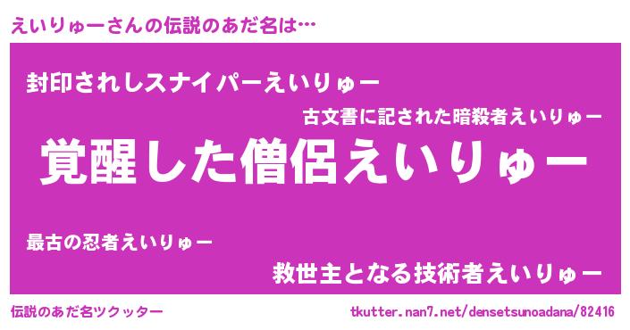 | 男性向けラノベタイトル風あだ名 | 『この素晴らしい世界にえいりゅーを!』 |
