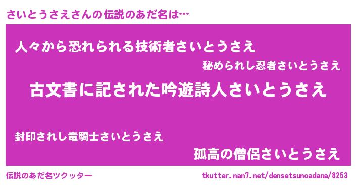 | ヘコむあだ名 | 『さいとうさえ(小並感)』『さいお』 |