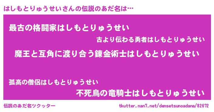 | 女子向けラノベタイトル風あだ名 | 『はしもとりゅうせい恋絵巻』 |