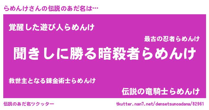 | ヒーロー風カッコイイあだ名 | 『ネオラメンケ』『天弓騎士ラメ』 |