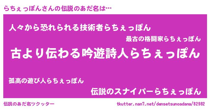 | ヒーロー風カッコイイあだ名 | 『ネオラチェッポン』『仮面ラチダー』 |