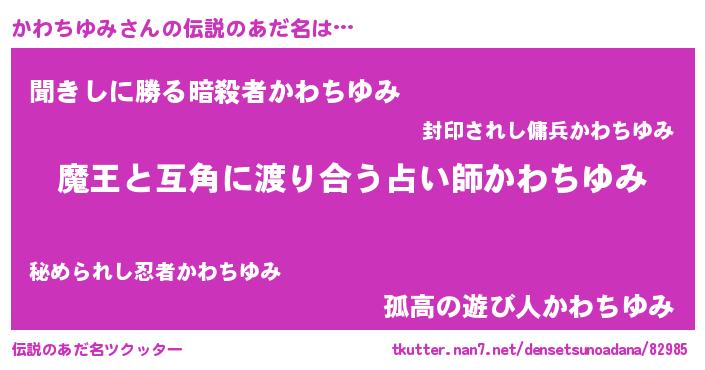 | ヒーロー風カッコイイあだ名 | 『仮面カワダー』『正義の使者かわちゆみ』 |