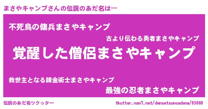 | 男性向けラノベタイトル風あだ名 | 『Re:まさやキャンプから始める異世界生活』 |
