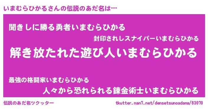 | ヒーロー風カッコイイあだ名 | 『幻影騎士イマ』『ネオイマムラヒカル』 |