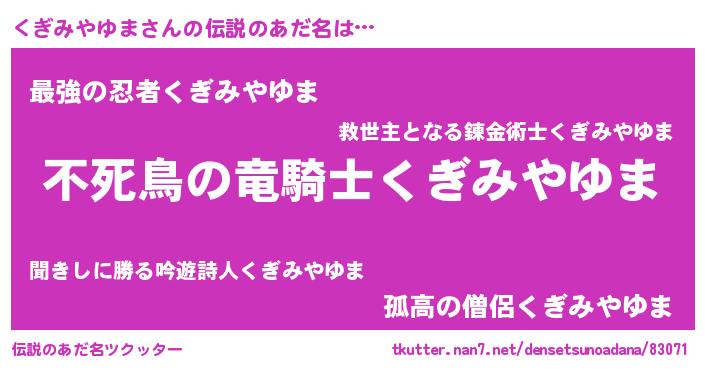 | ヒーロー風カッコイイあだ名 | 『仮面クギダー』『スーパークギミヤユマ』 |