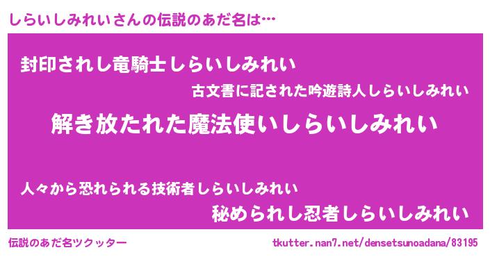 | 意味不明あだ名 | 『住所不定無職しらいしみれい(13歳)』 |