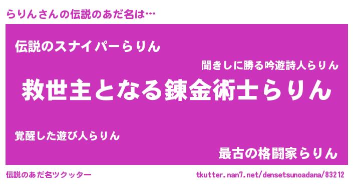 | 男性向けラノベタイトル風あだ名 | 『うちのらりんが世界を掌握している!』 |