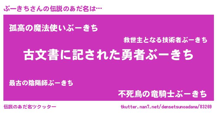 | 意味不明あだ名 | 『永久保存ぶーきち』『ペロリンぶーきち』 |