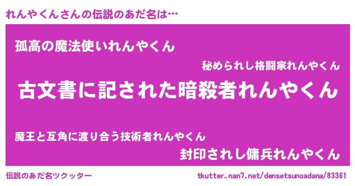 | 男性向けラノベタイトル風あだ名 | 『れんやくんに滅ぼされるだけの簡単なお仕事です』 |