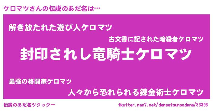 | 胡散臭い通販商品みたいなあだ名 | 『あなたにだけ特別に提供する100年もののヴィンテージワイン…その名も「ケロマツ」』 |