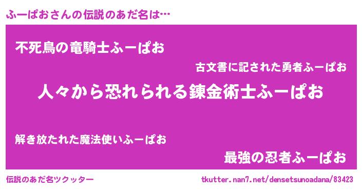 | 男性向けラノベタイトル風あだ名 | 『おまえをオタクにしてやるから、俺をふーぱおにしてくれ! 』 |