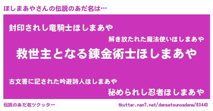 | 男性向けラノベタイトル風あだ名 | 『この素晴らしい世界にほしまあやを!』 |