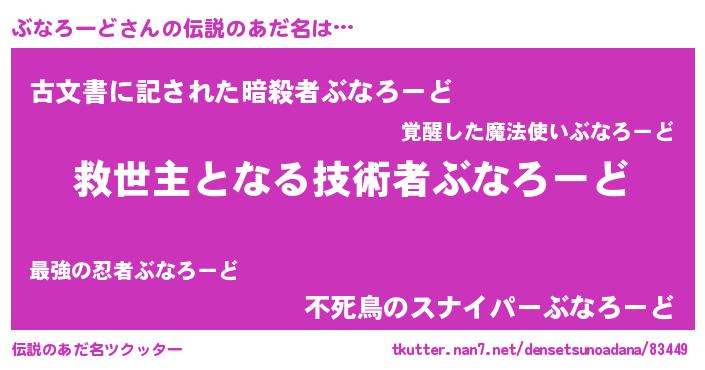 | 男性向けラノベタイトル風あだ名 | 『ぶなろーどに滅ぼされるだけの簡単なお仕事です』 |
