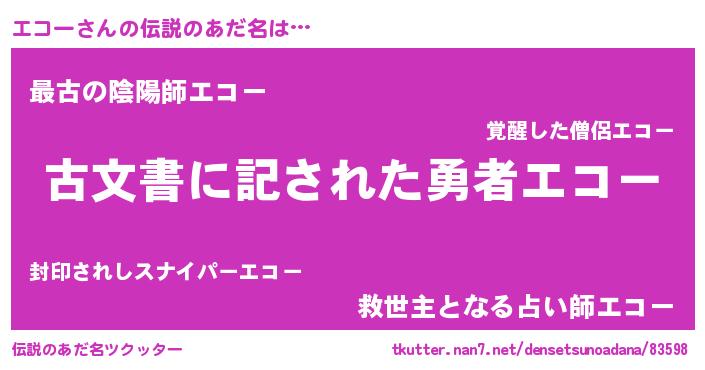 | 男性向けラノベタイトル風あだ名 | 『エコー~年齢イコール彼女いない歴の魔法使い~』 |