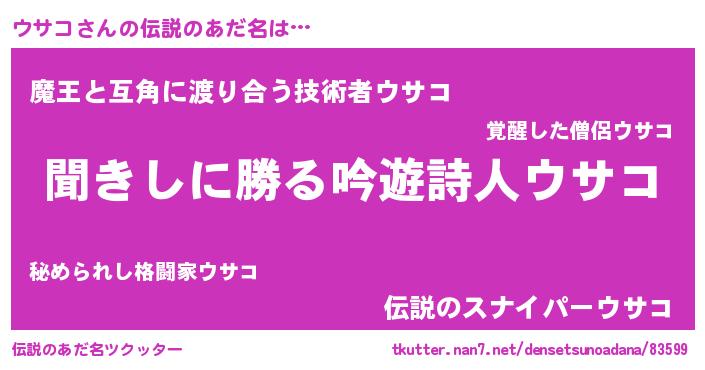 | 意味不明あだ名 | 『エリンギ科ウサコ属』『永久保存ウサコ』 |