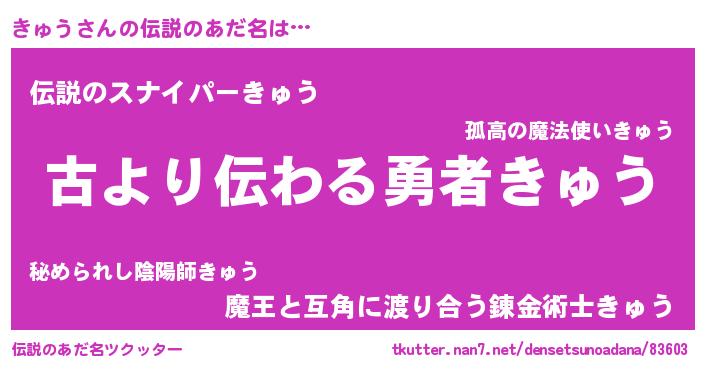 | 女子向けラノベタイトル風あだ名 | 『きゅうの契約王妃』『きゅう恋絵巻』 |