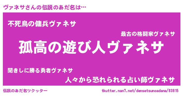| 男性向けラノベタイトル風あだ名 | 『魔弾の王とヴァネサ』『ヴァネサの憂鬱』 |