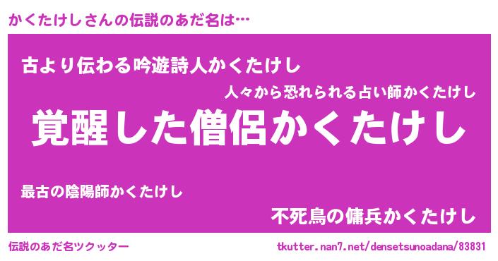 | 男性向けラノベタイトル風あだ名 | 『この素晴らしい世界にかくたけしを!』 |