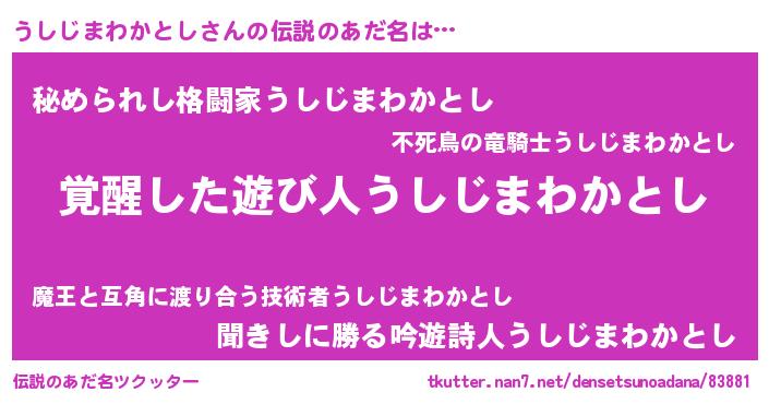 | 男性向けラノベタイトル風あだ名 | 『うしじまわかとし~年齢イコール彼女いない歴の魔法使い~』 |