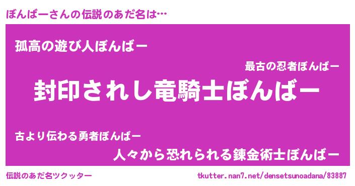| 男性向けラノベタイトル風あだ名 | 『ぼんばー~年齢イコール彼女いない歴の魔法使い~』 |