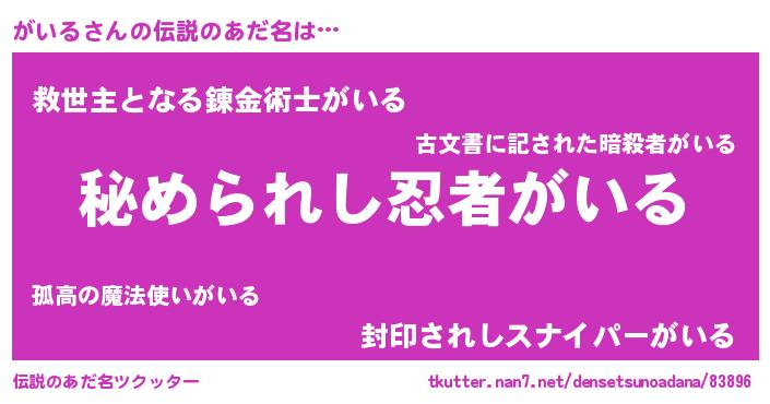 | 女子向けラノベタイトル風あだ名 | 『がいるの雑貨屋さん』『がいる恋絵巻』 |
